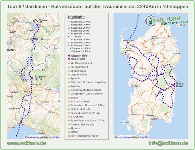 Unsere heutige Tour beginnt nach dem Frühstück. Wir folgen der legendären SS125 entlang der Ostküste und legen unterwegs eine wohlverdiente Pause im Silana Biker-Pub ein. Weiter geht es nach Westen in Richtung Monte Ortobene, von dort aus führt uns die Route erneut nach Süden. Wir überqueren Sardiniens höchsten asphaltieren Pass, den Passo Arcu Correboi (1246 m) und nehmen bei der Gelegenheit auch noch den Passo di Caravai mit 1118 m Höhe mit, bevor wir am späten Nachmittag wieder unser Hotel erreichen.